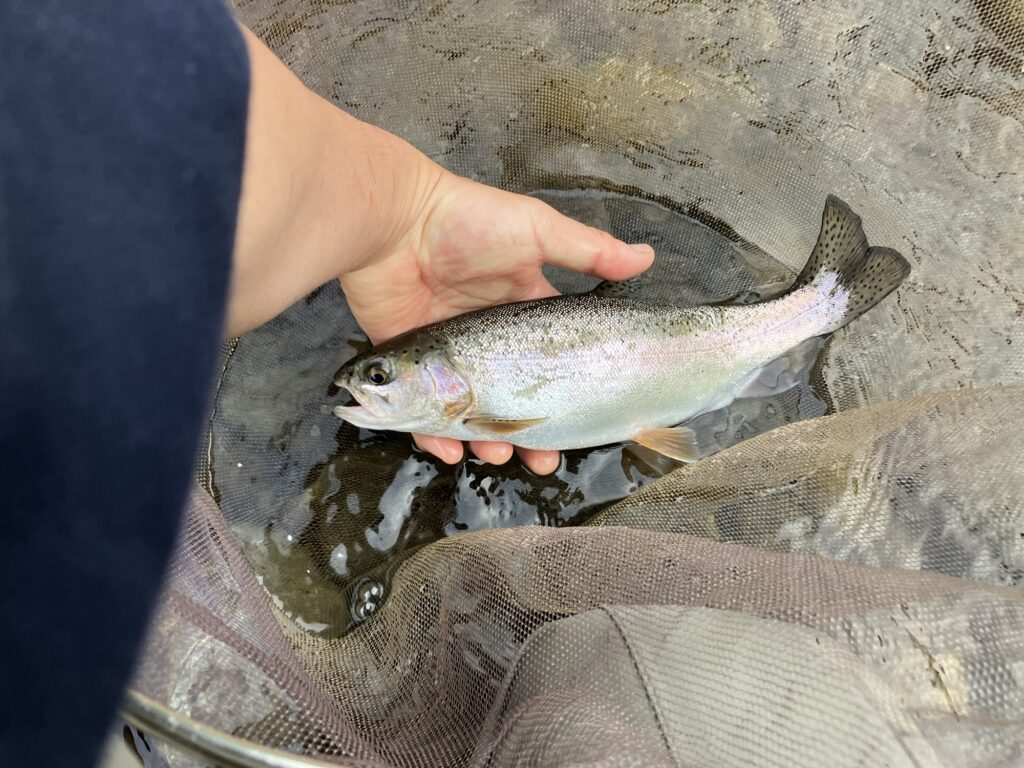5月。虫が飛び交う中、小型スプーンで釣れたヤマメ。