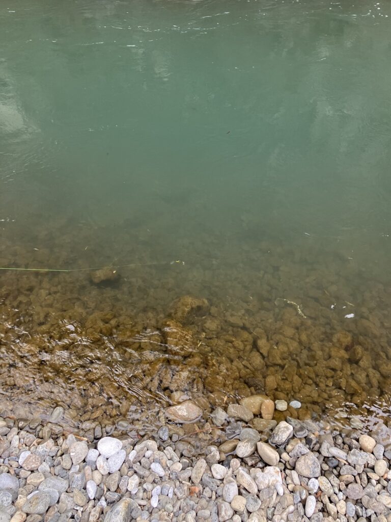 ダムを挟んだ上流と同じく、やはり少し濁っていますね。石にもシルト質の泥が被っている。