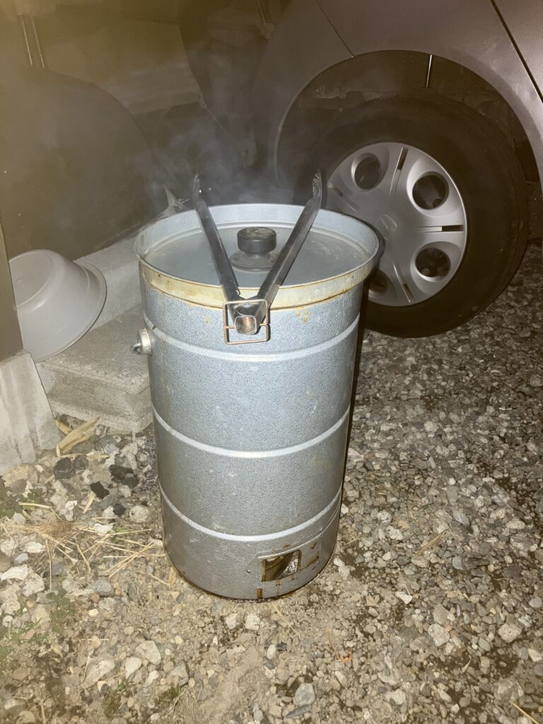 2時間もスモークすれば充分でしょう。冬から春先は風が強い日が多いので火事には気をつけましょう。