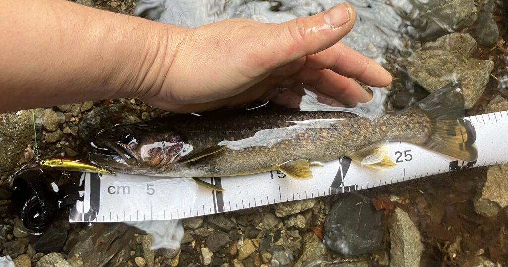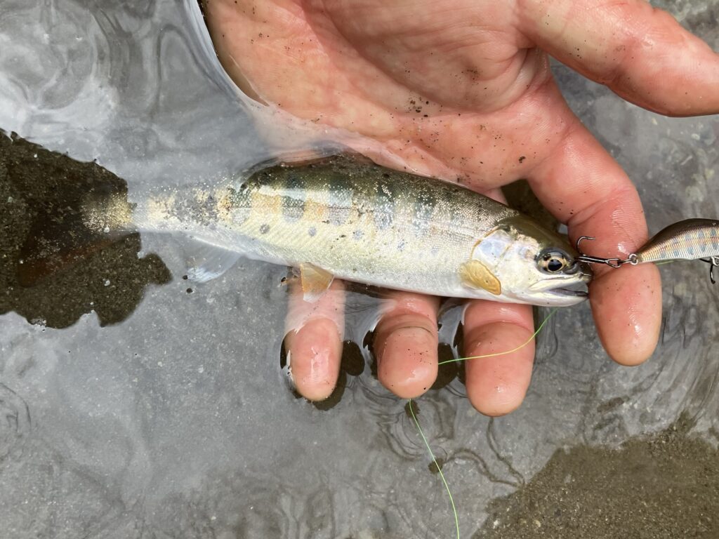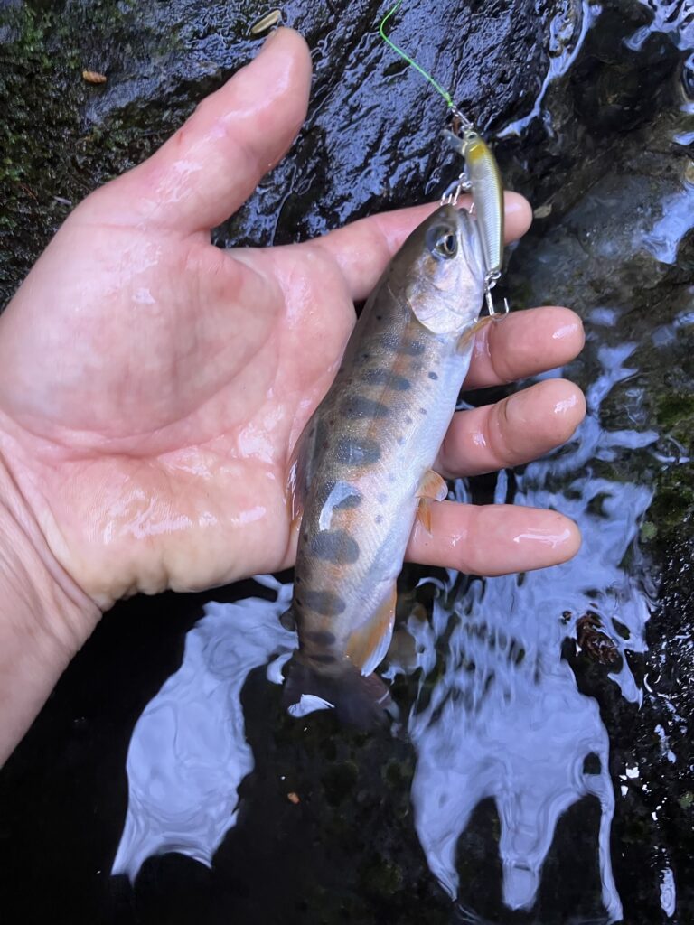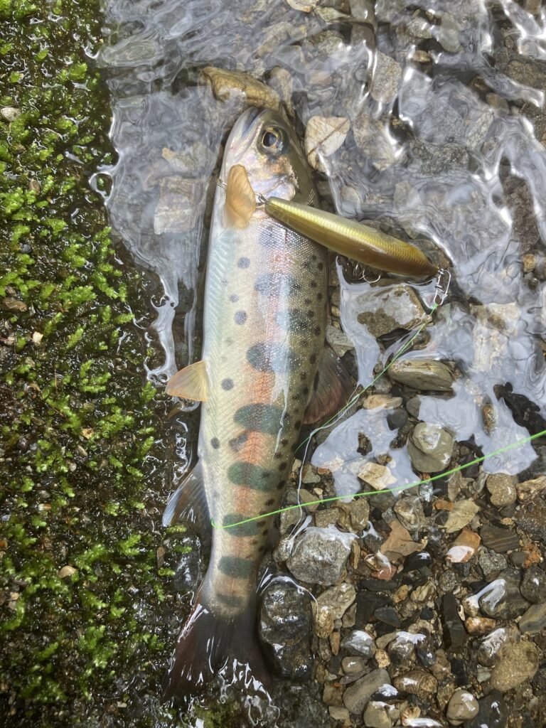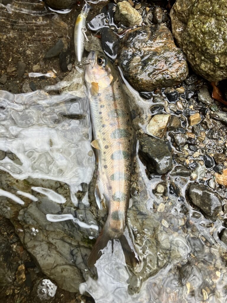 途中、先ほど尺イワナを釣ったミノーがリップ割れで殉職したので、シュガーミノーに替えました。